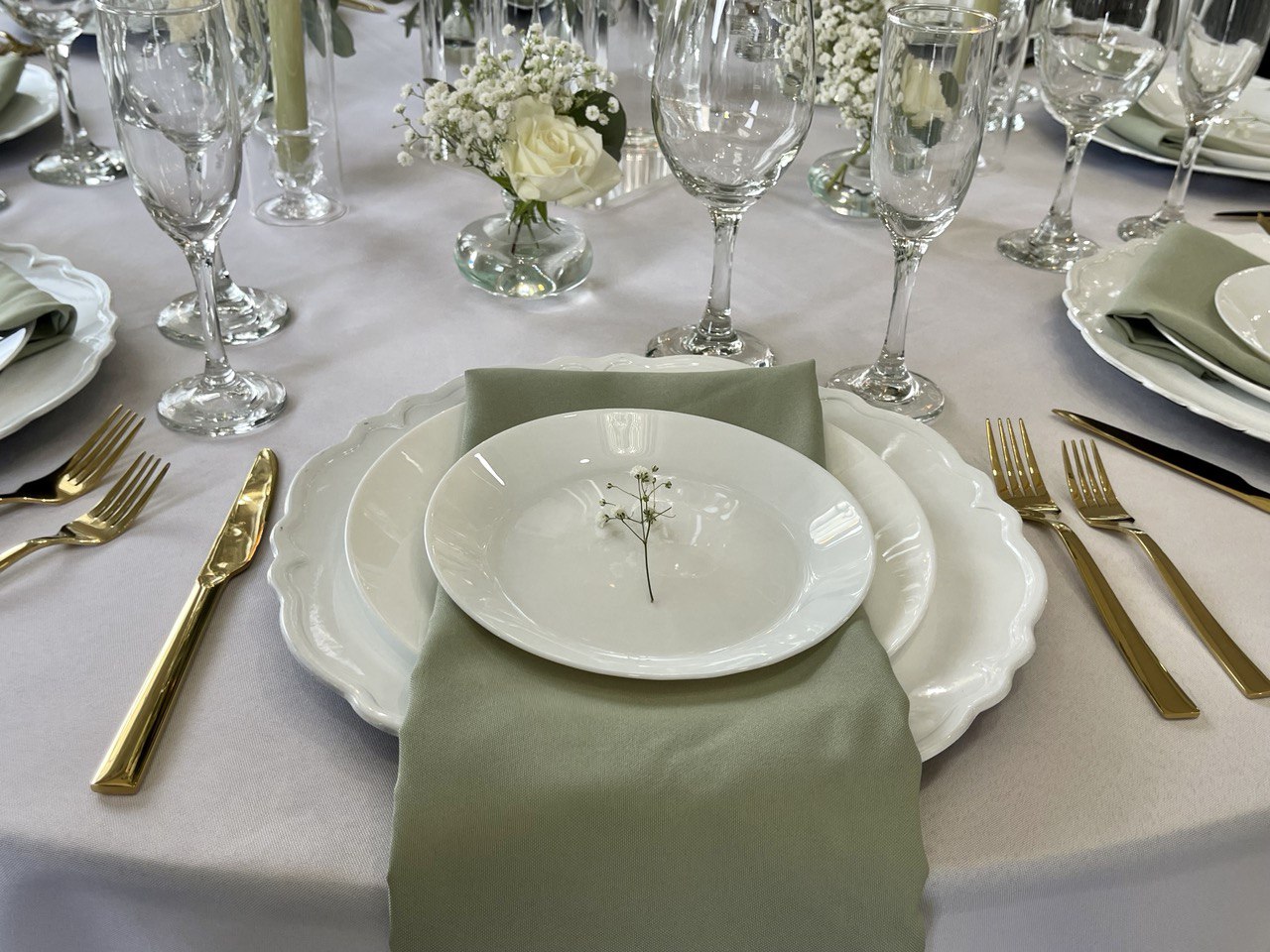 Deliver and set up (plates, plate chargers, glasses, napkins, and silverware.)